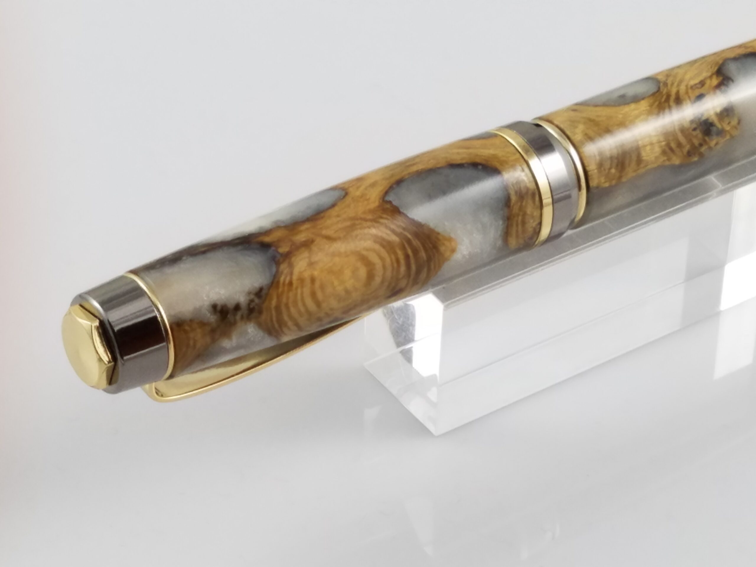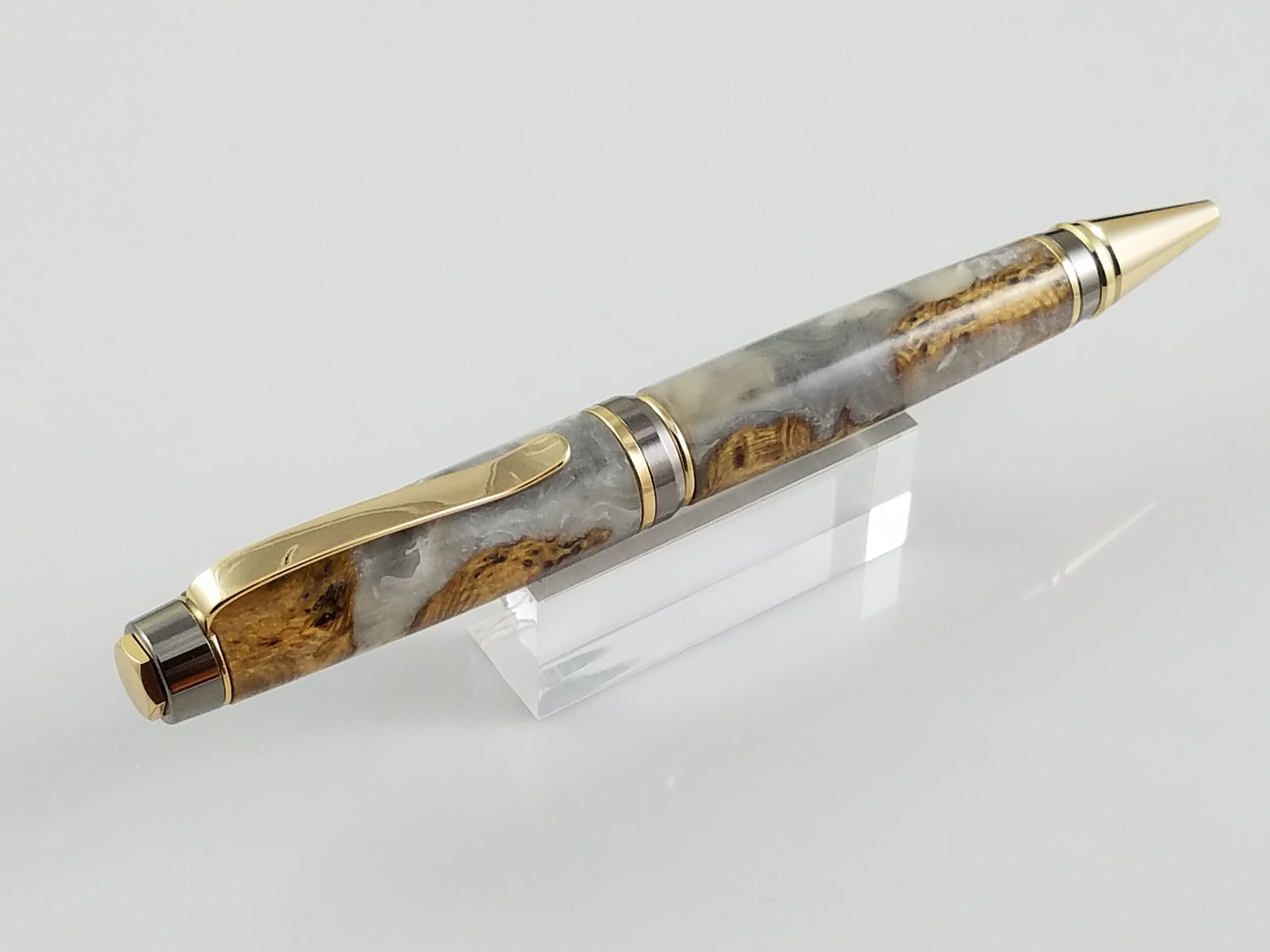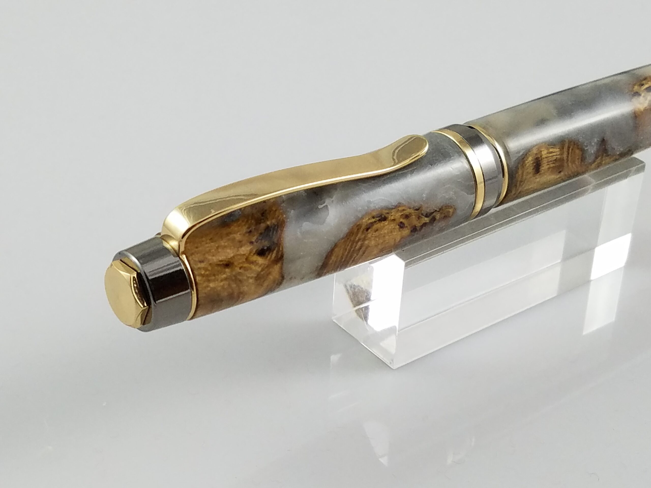 Discover the new, Gun metal and 24 Kt plating styling on this big, handsome, powerfully built writing instrument made with Cholla Cactus, cast in black, white and mother of pearl.