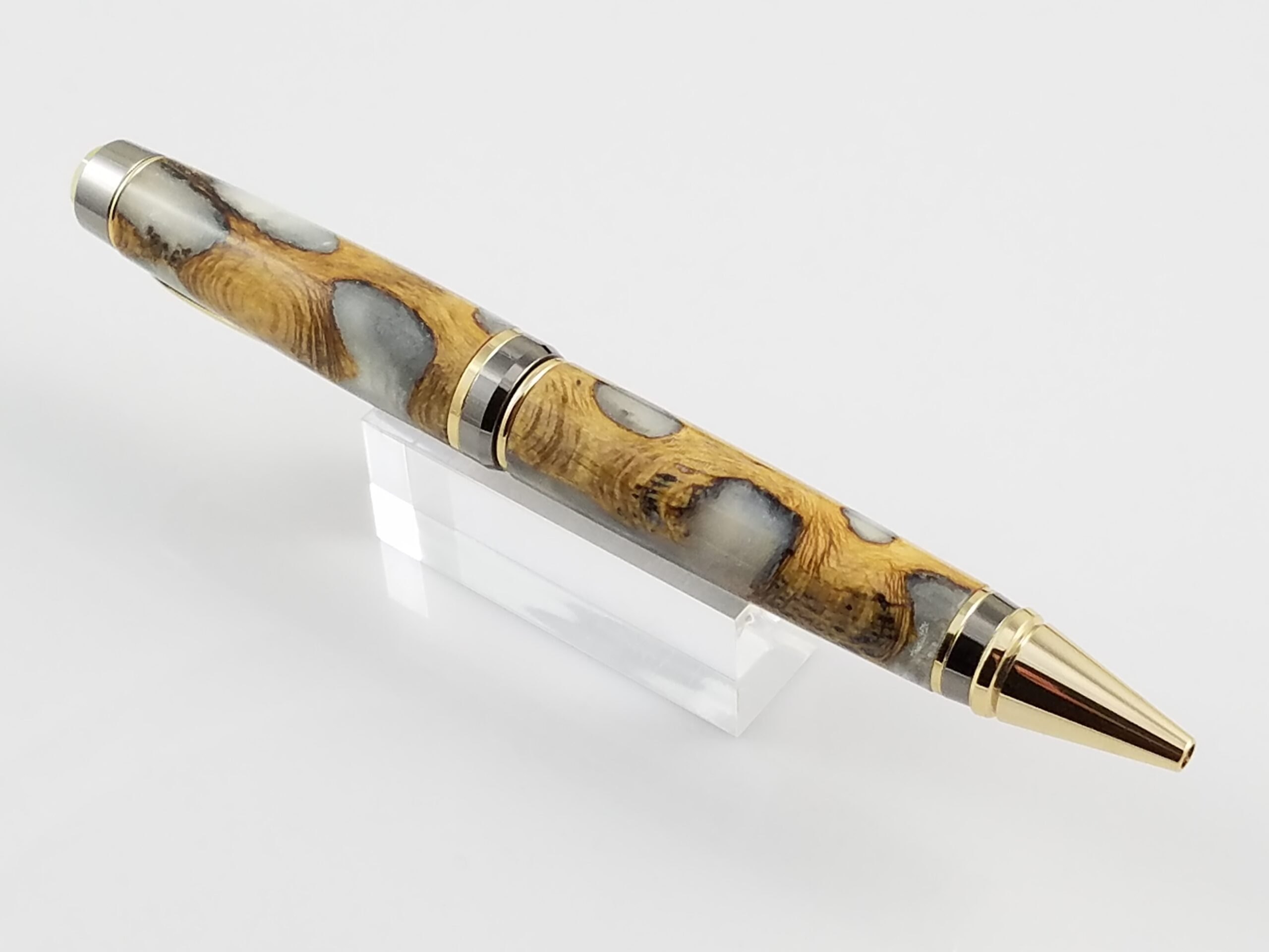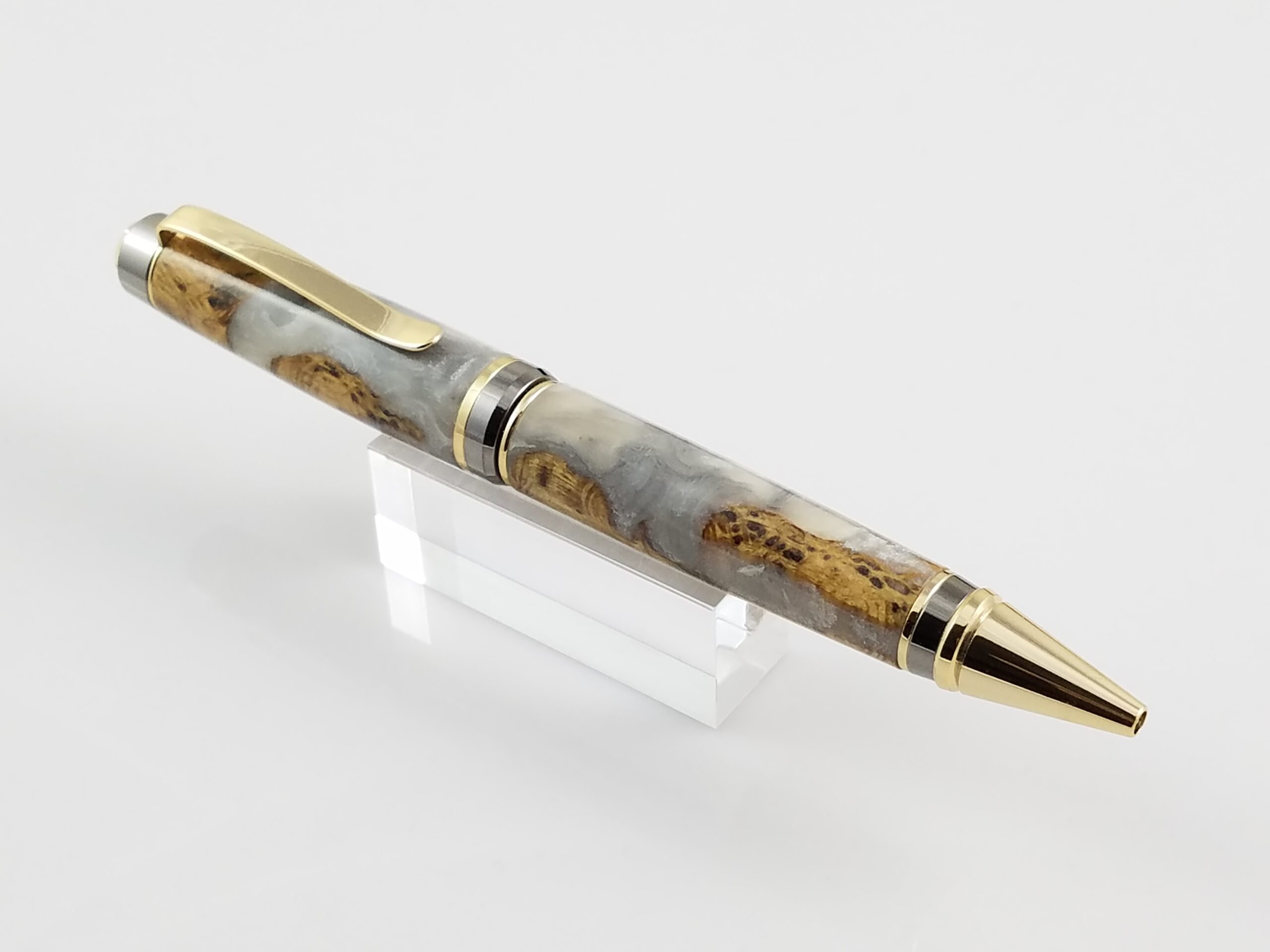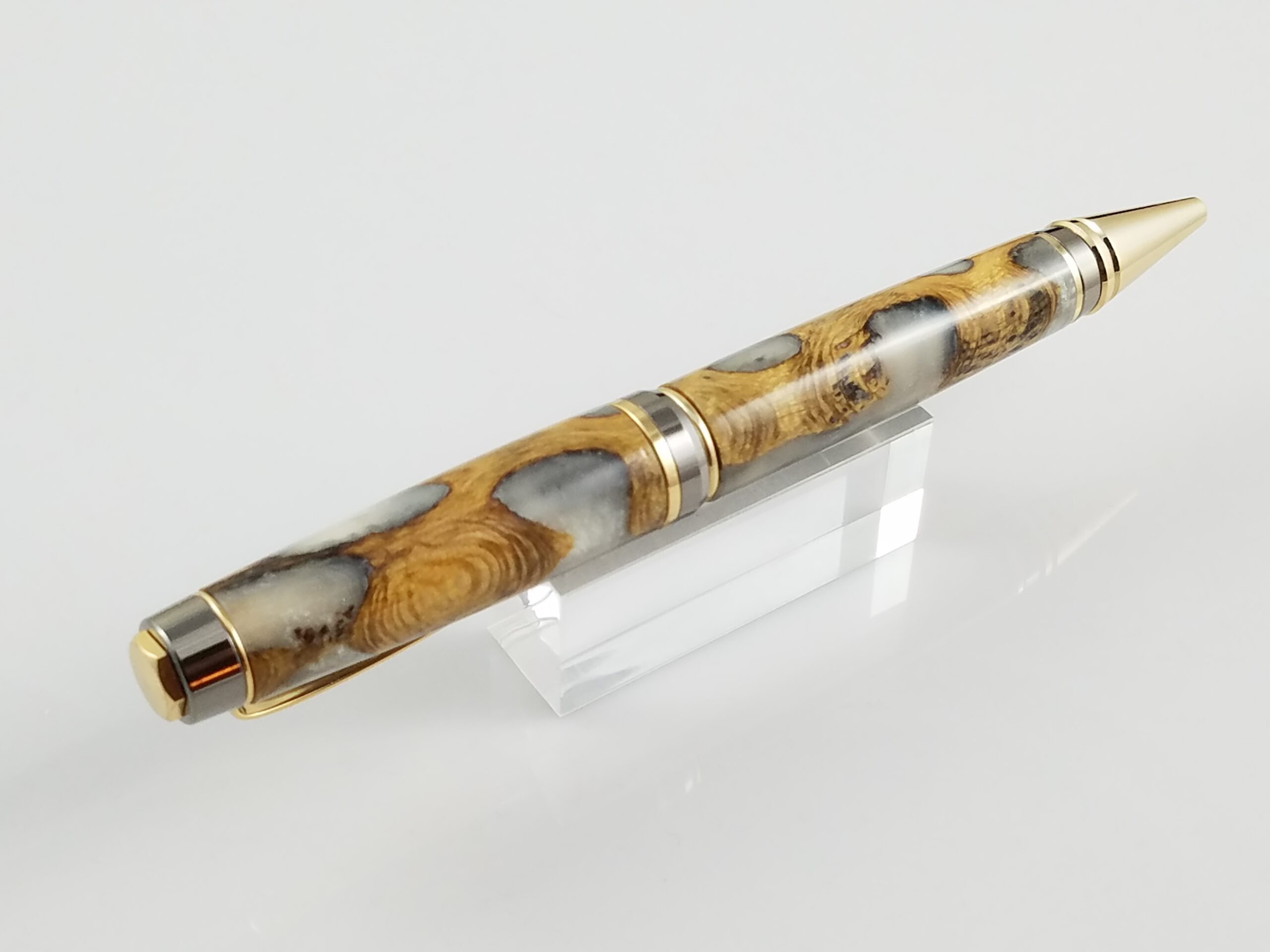 Discover the new, Gun metal and 24 Kt plating styling on this big, handsome, powerfully built writing instrument made with Cholla Cactus, cast in black, white and mother of pearl.