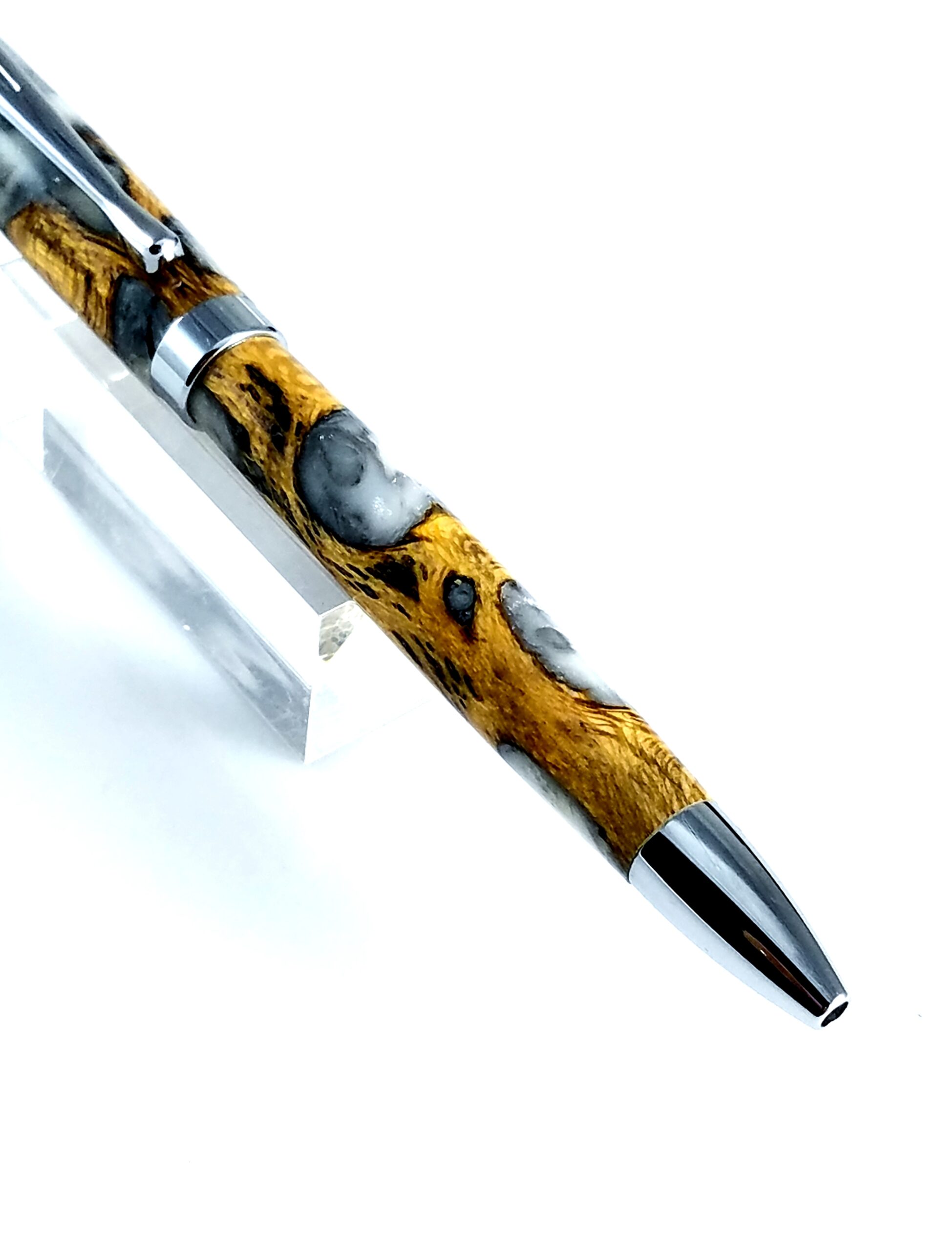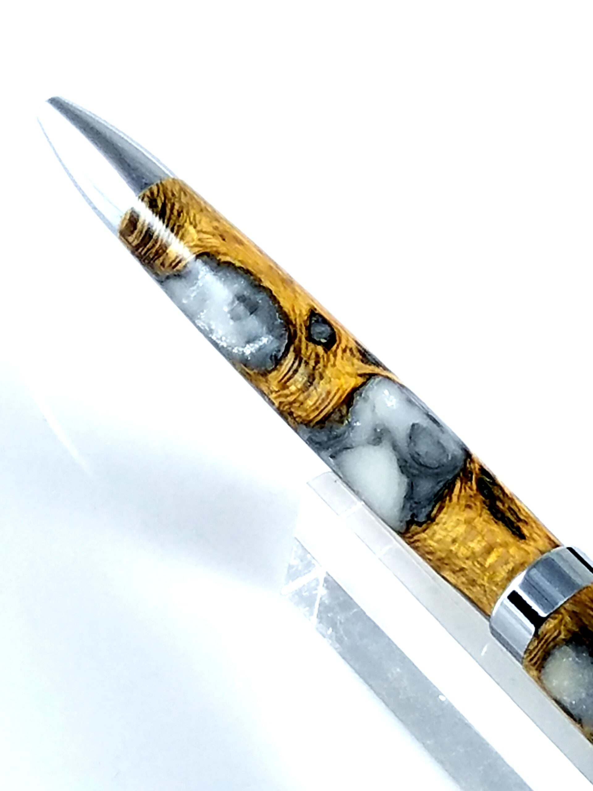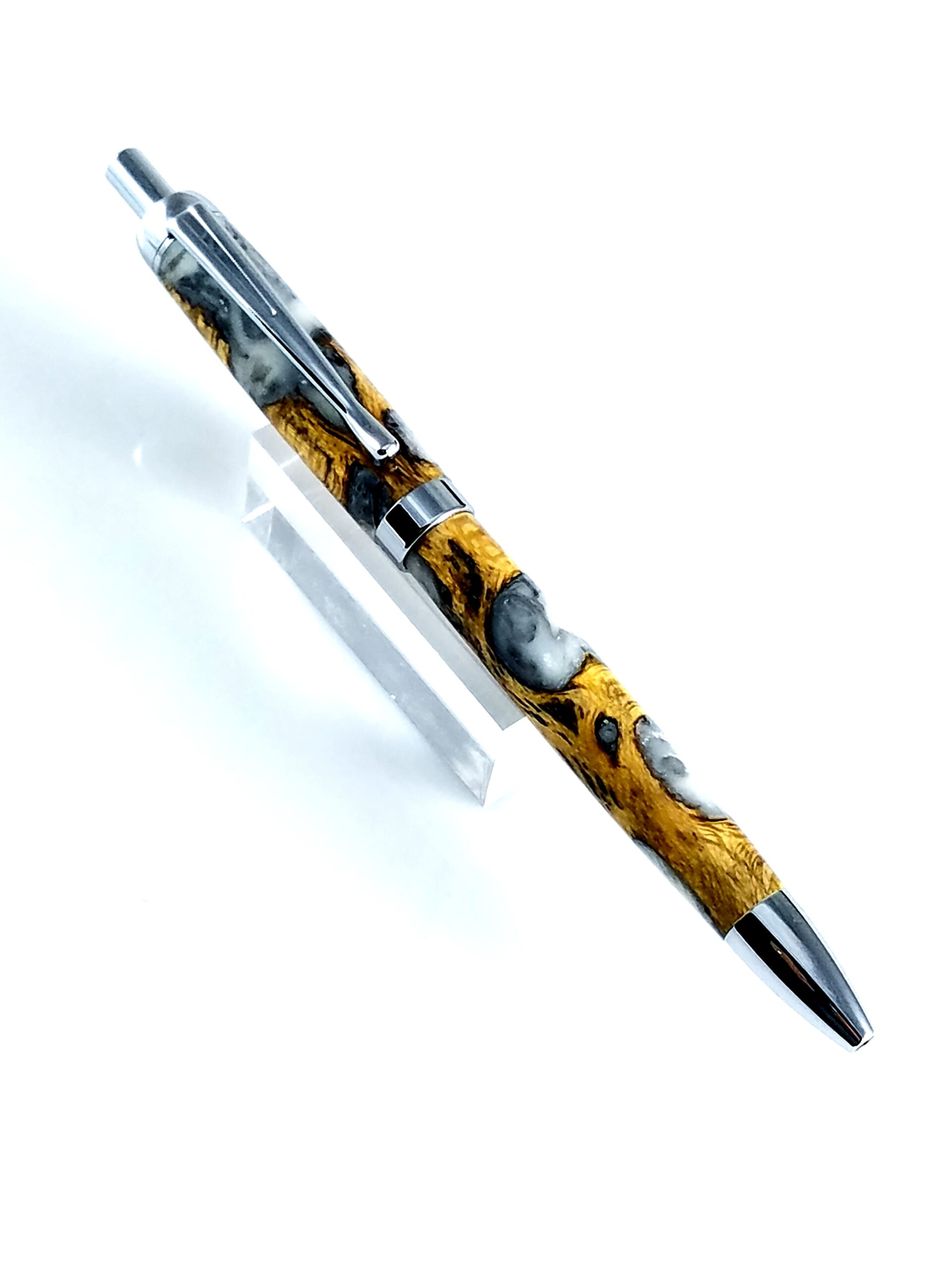Created from the ground up, this pen features a German made mechanism. With a specially designed click mechanism, the Tempest ballpoint pen provides at long last, a click ballpoint with a reliable and trustworthy clicker, that keeps on working. Beautifully crafted in Cholla cactus cast in Alumilite. This will be your new favorite click pen frame!